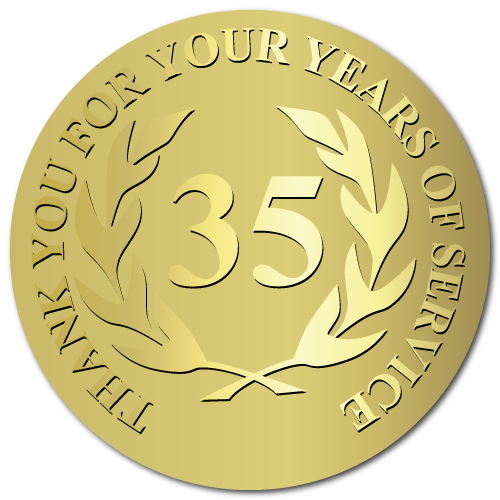 NEW! 35 Years of Service, 2" Gold Foil Stamped & Embossed Award Labels