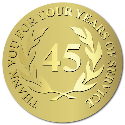 NEW! 45 Years of Service, 2" Gold Foil Stamped & Embossed Award Labels