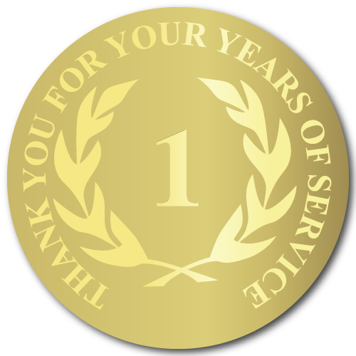 Our 1 Year Gold Foil Stamped Gold Award Labels are perfect for employee recognition. Add these to letters and awards to present to them for their dedicated years of loyalty and service to to the company. These labels are Foil Stamped and have Gold Hot Foil Stamping.