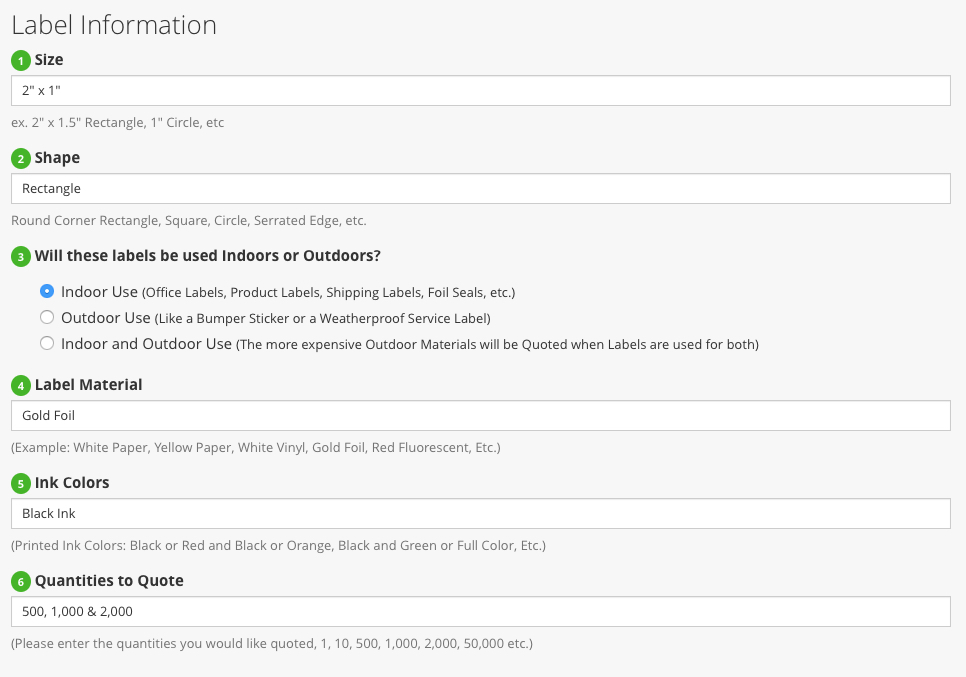 Now that we have a way to contact you with the proof, we need to know what kind of labels you need. You can be very specific here, you can tell us the size of the labels in inches or metric system, more common label sizes are meassured in inches, for example a 2" width and a 1" height rectangle, if you are unsure you can just let us know a round figure of what your labels need to be and we can help you figure the right size.
