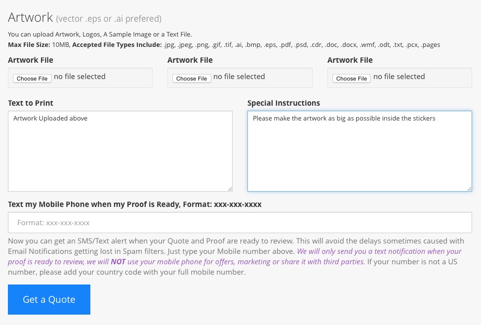 We accept a variety of file formats for artwork, the best results come from vectorized artwork in EPS or AI format, the highest resolution you can give us the sooner your proof will be done, If you do not have artwork you can also just specify the text you want printed, we can also help you design your labels with clipart of your choise, you can attach any images you want on your artwork under the artwork files